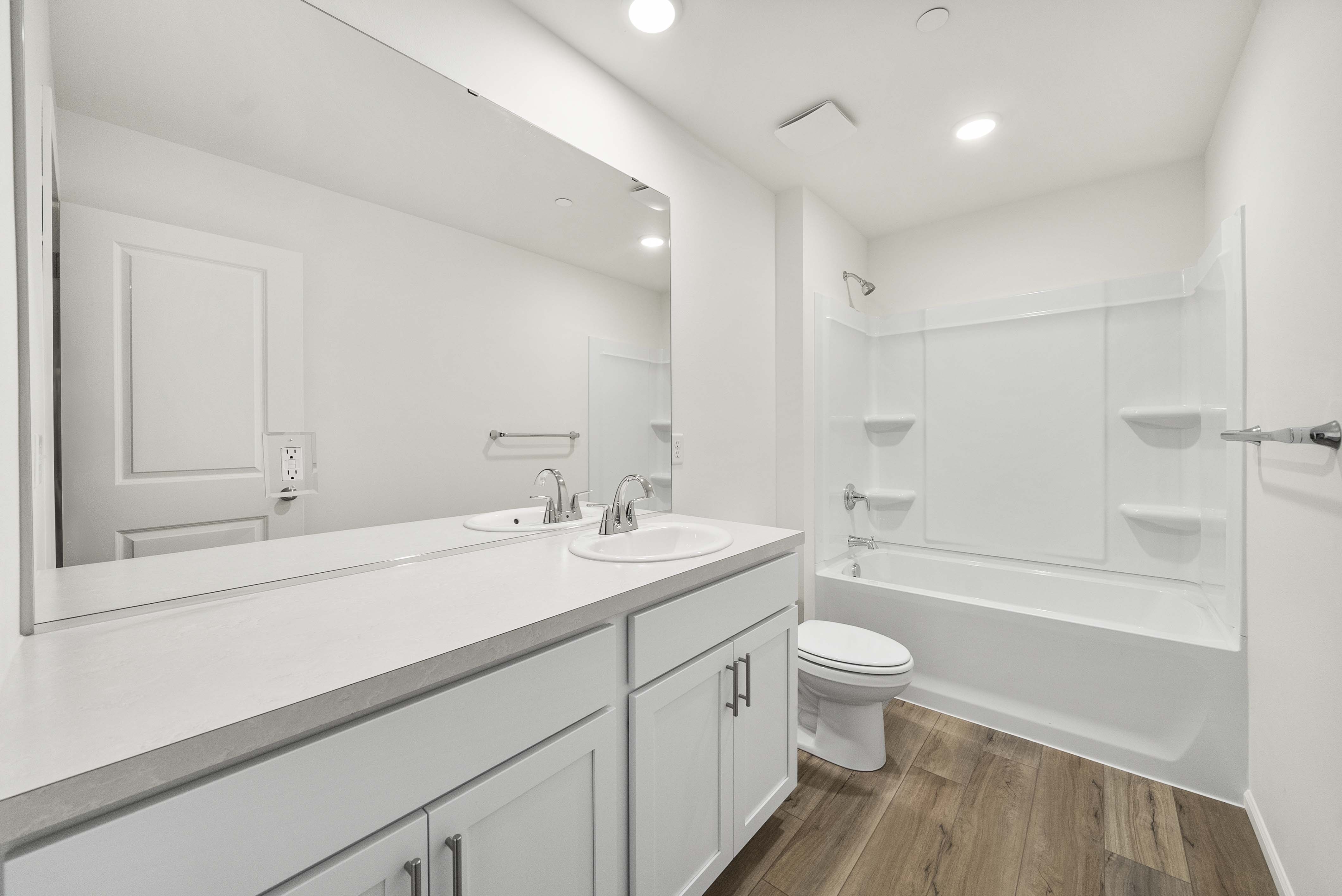 Additional included features like two-bay garages, 9’ ceilings on the main floor, luxury vinyl plank flooring, Ecobee® Premium Pro thermostats, and Schlage® electronic front door locks elevate everyday living. Select homesites also offer optional covered patios and open railings for added comfort and style.